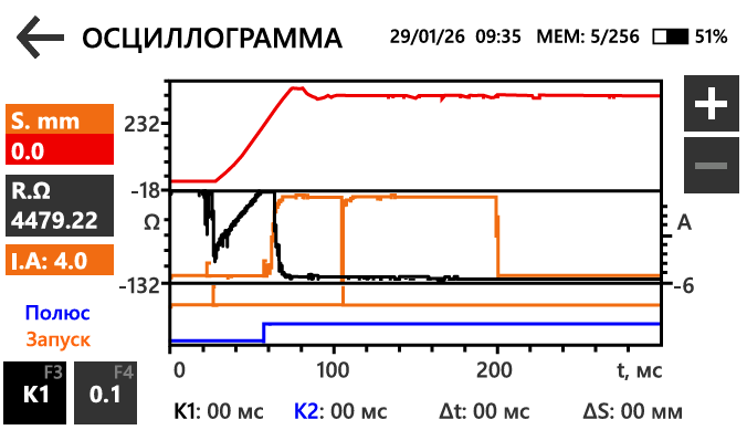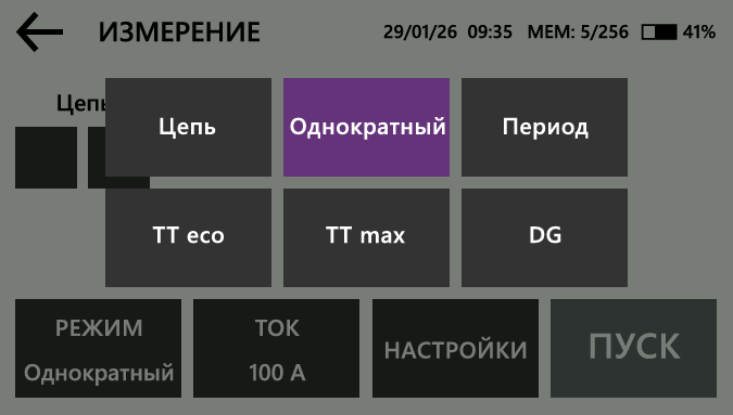 Однократный запускается после подключения измерительных зажимов к объекту и нажатия кнопки «СТАРТ». Периодический работает с заданными интервалами, что удобно при занятых руках во время подключения кабелей. Интервал между измерениями настраивается, прибор выполняет измерения непрерывно до остановки пользователем. Периодическая цепь активируется кнопкой «СТАРТ» и используется для непрерывных измерений. После подключения кабелей и замыкания цепи измерение начинается автоматически. Для повторного запуска измерения необходимо разорвать измерительную цепь и подключить её заново.