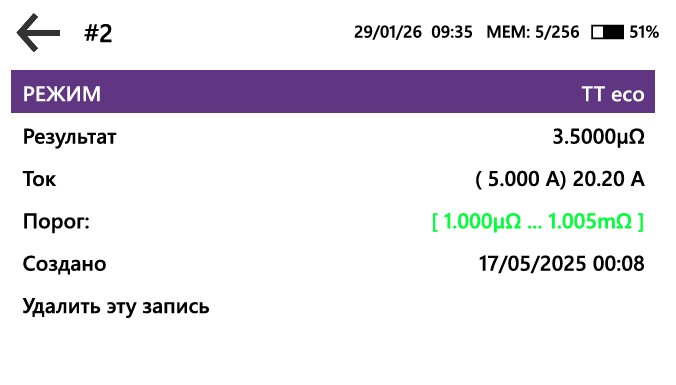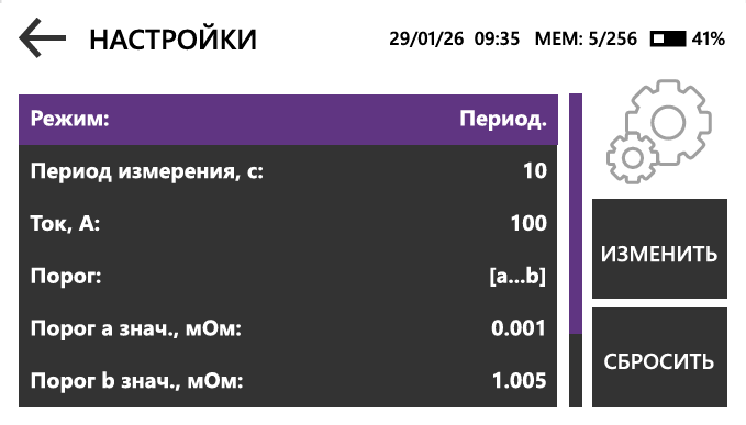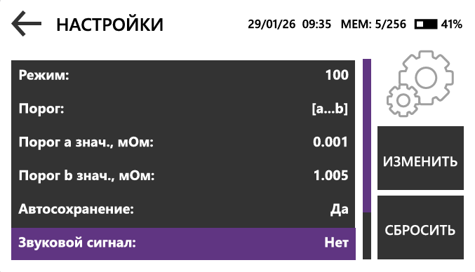 Пользователь может настроить пороговые и эталонные значения, интервал запуска измерений в периодическом режиме, автосохранение результатов и звуковую индикацию начала и окончания измерения, а также величину измерительного тока.