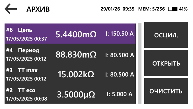 Быстрый выбор измерительного тока в диапазоне до 200 А. Доступны несколько вариантов настройки: фиксированные значения 10, 50, 100 и 200 А; автоматический режим; ручная установка тока от 1 до 200 А с шагом 1 А.