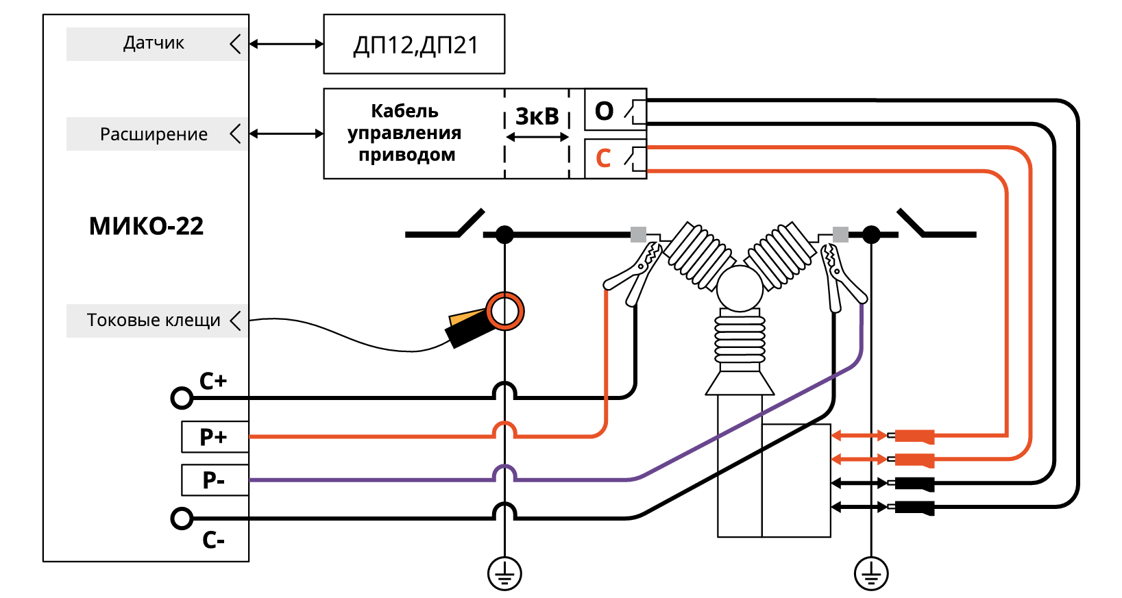 Схема подключения МИКО-22 к высоковольтному выключателю для проведения последовательного измерения электрического сопротивления методом DCRM и методом DG