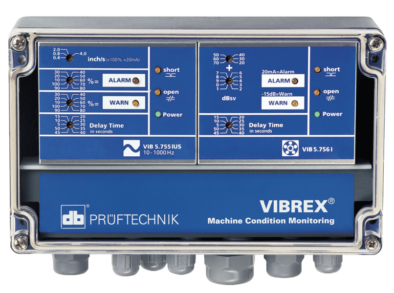 Прибор VIBREX предназначается для непрерывного контроля машин, которые работают с постоянной частотой вращения и постоянной нагрузкой. Модульная конструкция позволяет адаптироваться под специфические характеристики машин. Это идеальное устройство для контроля особых характеристик сигнала редукторов и низкоскоростных машин. Сигналы машины измеряются при использовании двухфункционального датчика и обрабатываются соответствующими электронными модулями: модуль вибрации используется для контроля вибрации, а модуль антифрикционного модуля используется для контроля состояния подшипника.