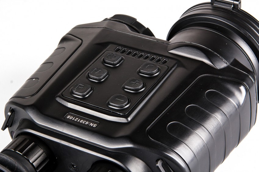 Кнопки управления расположены сверху, прямо под пальцами. При регулировке параметров не нужно отвлекаться. С помощью кнопок можно настроить глубину резкости, откалибровать матрицу, использовать цифровой зум, записать фото и видео, сохранять их. Кнопки достаточно большие, можно работать в перчатках. Есть несколько режимов под разные ситуации: для поиска тепла днём, ночью, на море и в пустыне. Тепловизионный бинокль оснащён разъёмом под штатив, что удобно для долгого наблюдения и разъёмом под кабель RS-232 для внешнего управления.