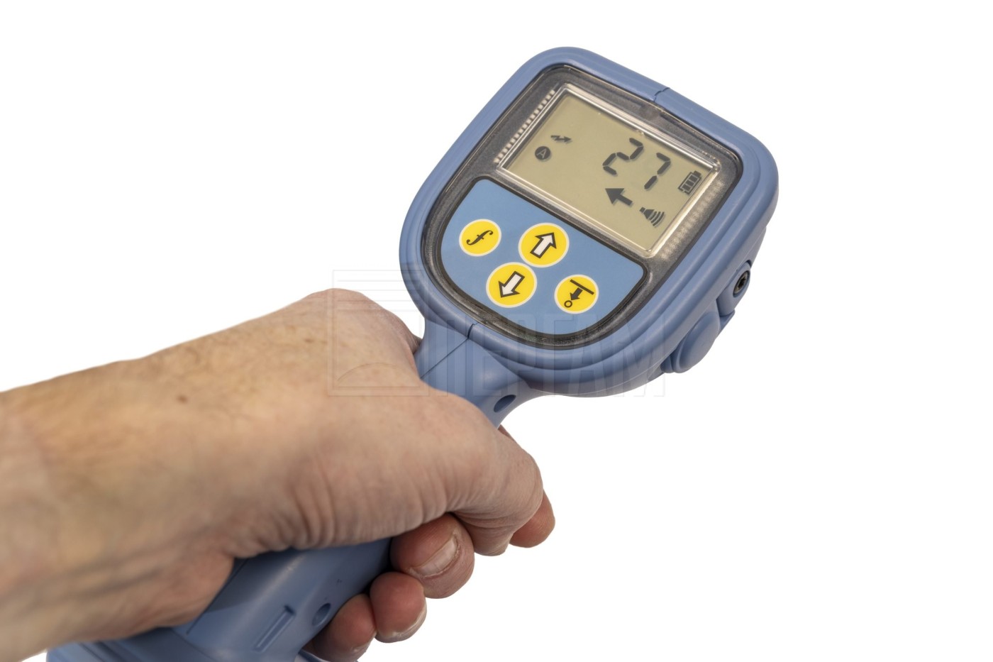 Генератор подаёт сигнал на металлическую трубу или кабель — напрямую или индукцией. Локатор ловит ответ и ведёт оператора стрелками «влево / вправо» прямо над коммуникацией. Глубина — до 5,8 м. - Пассивный режим (50/60 Гц)