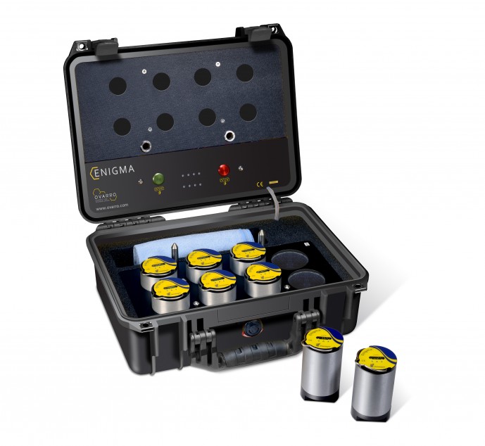 ENIGMA compact – не имеет радиоканала, не имеет проводов, а значит, нет потери информации которая снимается с трубы. Результатом является высокая эффективность обнаружения утечек. Течеискатель состоит из 3 герметичных датчиков (минимальное количество датчиков 2 шт), которые установлены в водонепроницаемом кейсе. Кейс предназначен для хранения, транспортировки и программирования датчиков через USB порт компьютера. В отличие от предыдущей модели Zetacorr, Enigma осуществляет связь с ПК при помощи оптронной связи, что резко увеличило скорость считывания информации. Это крайне удобно при работе в режиме обследования сети. Кроме этого датчики можно программировать и считывать без ПК, при помощи одного кейса.