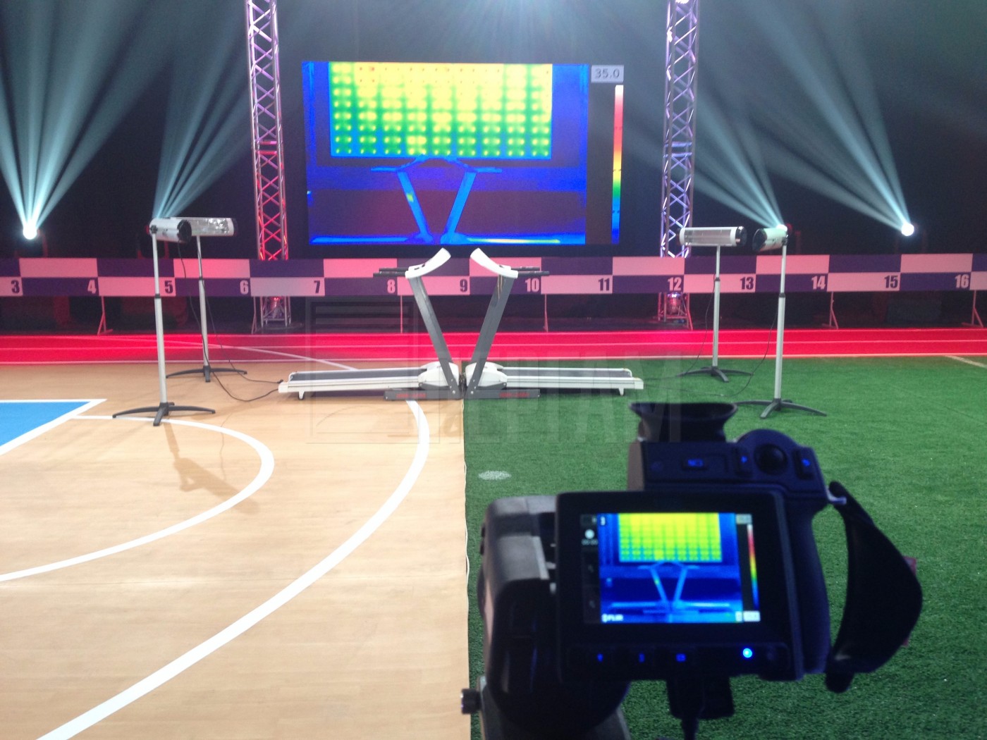 На съёмочной площадке телекомпании «Амедиа» установили две беговые дорожки: спортсмен на одной из них был одет в повседневую хлопчатобумажную футболку, а второй облачился в «олимпийские одежды» из современного синтетического материала. Специалист компании ПЕРГАМ фиксировал происходящее с помощью нового тепловизора FLIR T1020, оснащённого HD матрицей с разрешением 1024 × 768 пикселей. Полученное тепловое видео транслировалось на огромный экран в режиме реального времени.