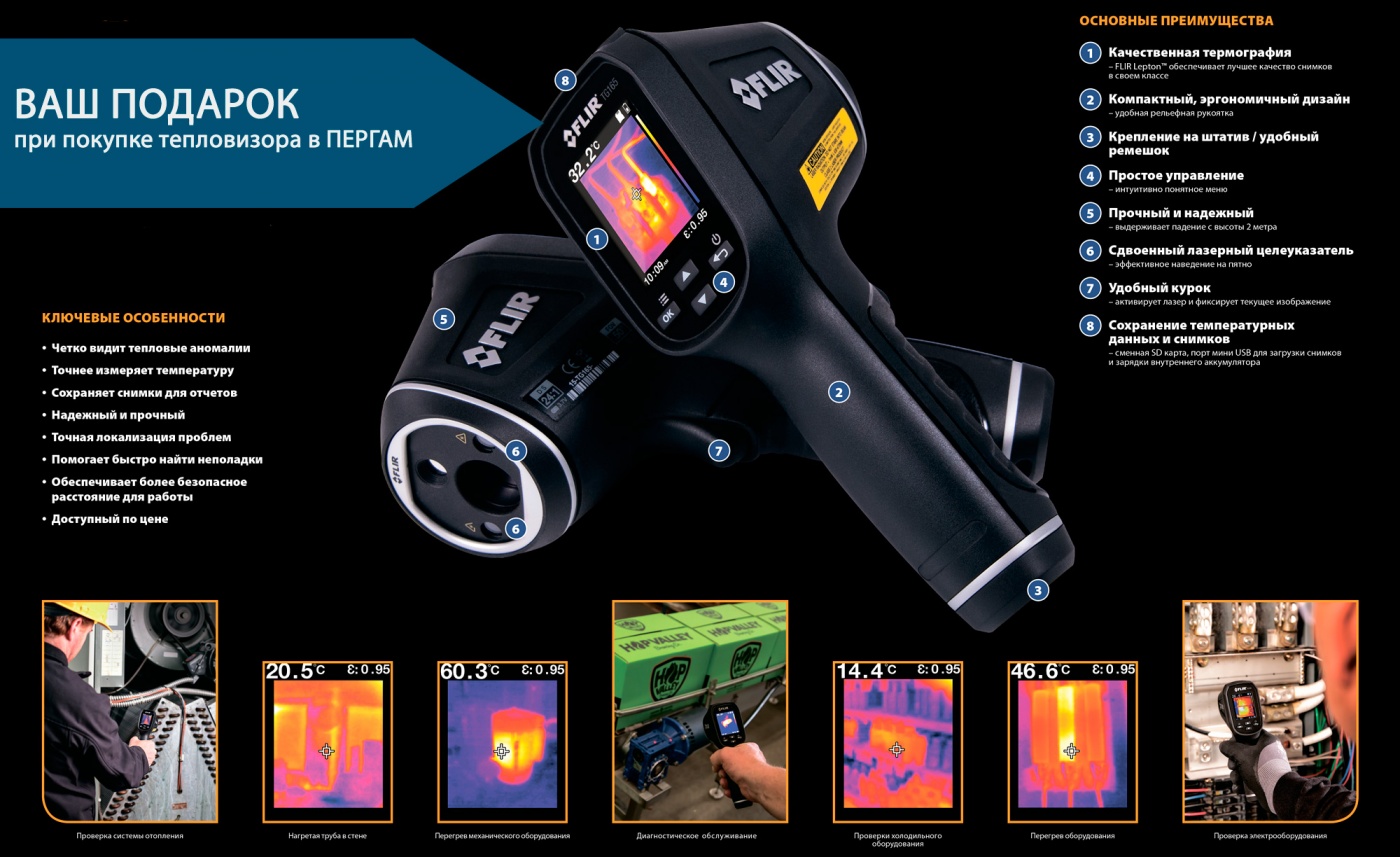 Для тех, кто ценит своё время и заботится о качестве предоставляемых услуг, мы подготовили специальное предложение. Компания Пергам объявляет о начале акции «Купите тепловизор и получите инфракрасный термометр Flir в подарок».